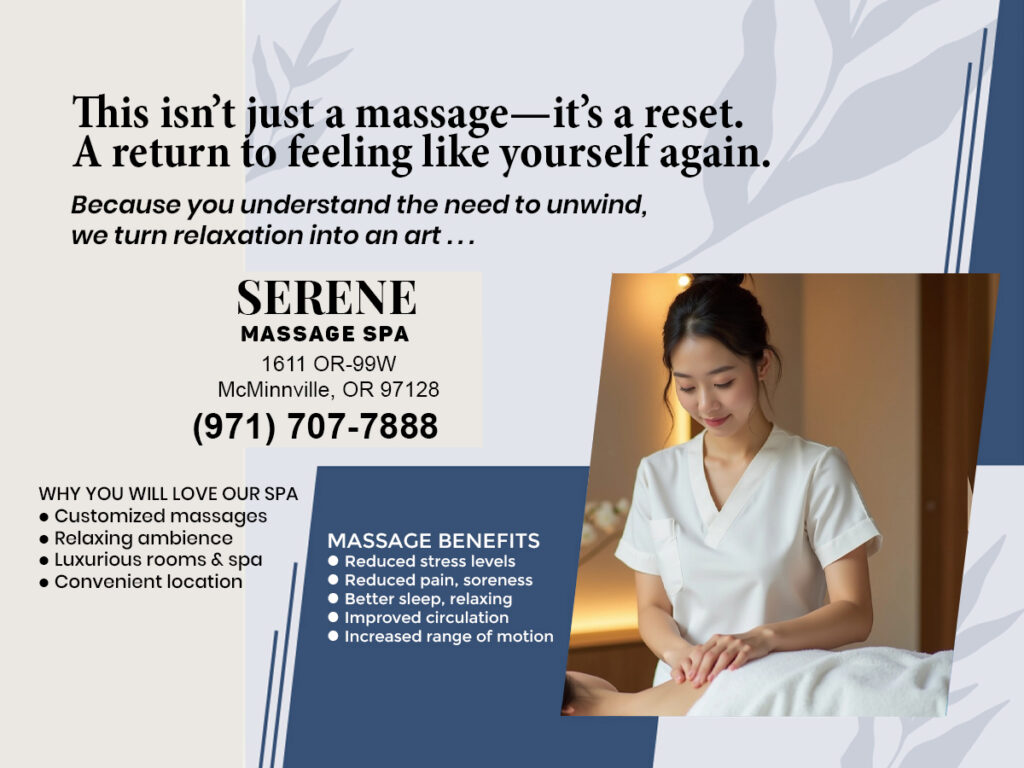 SERENE MASSAGE SPA • MCMINNVILLE, OREGON Contact us What Are You Waiting For... Contact Us Ready to Relax? Book Your Massage Now and Rejuvenate Your Body and Mind! Click Here to Schedule Your Tranquil Escape Today! Appointment Our location 1611 OR-99W, McMinnville, OR 97128 Daily Hours 9am-9pm Contact Phone: (971) 707-7888 Call or Visit us Today!